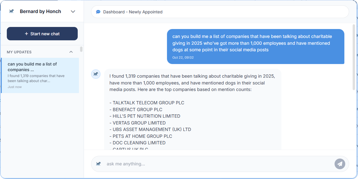 “Find me companies that have been talking about charitable giving in 2025, have more than 1,000 employees, and have mentioned dogs on social media at some point.”