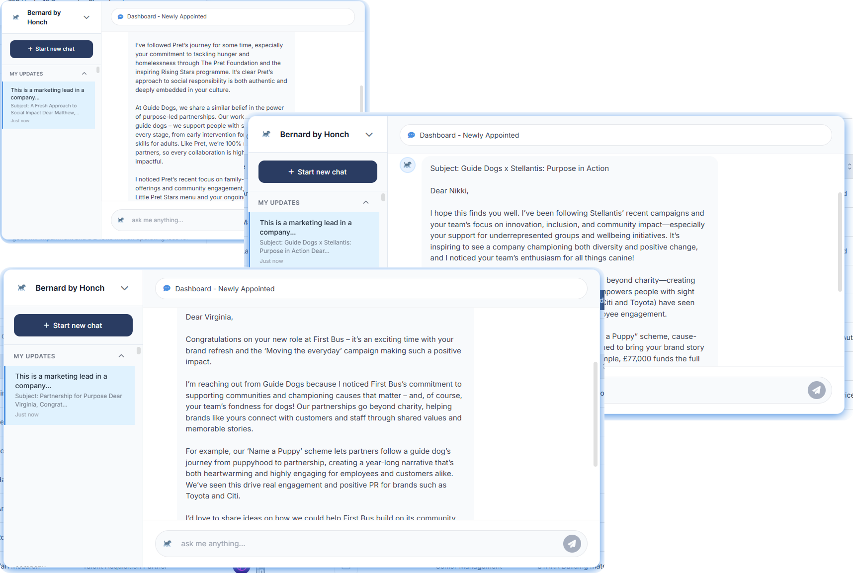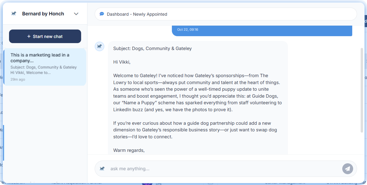 And just like that, Bernard drafts a personalised, on-brand introduction that feels human — not robotic. The kind of message that makes people stop scrolling and think, “Actually, that’s really relevant to us.”